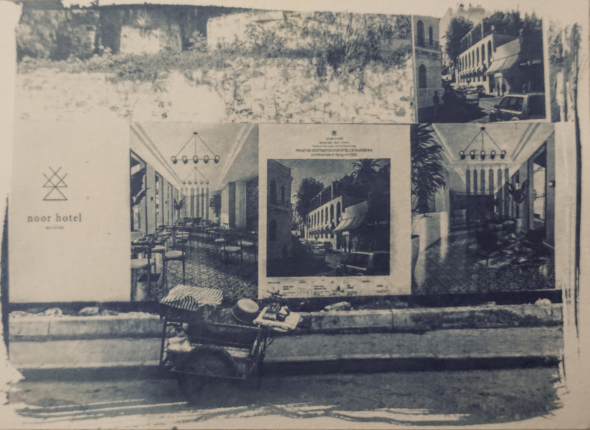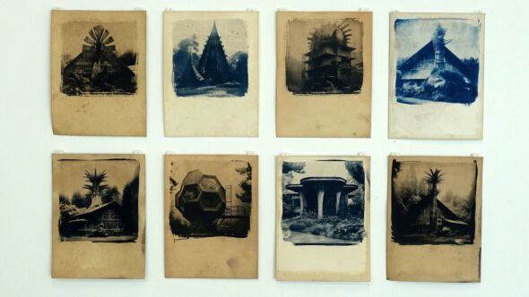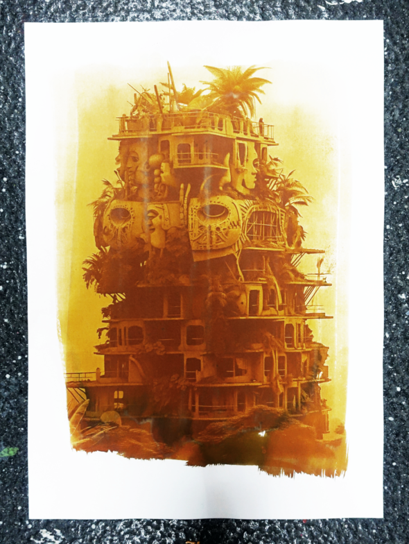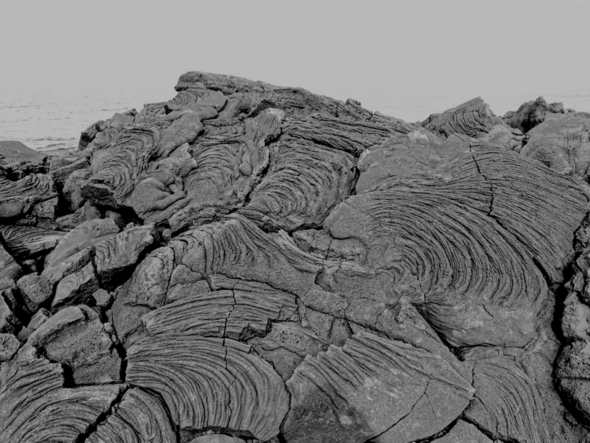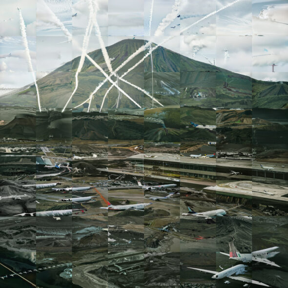 Ces images fragmentées recomposent une vision où se mêlent volcans, cendres volcaniques, accumulations de navires et d’aéronefs aux formes décomposées. Ce chaos visuel, traversé par la matière en transformation, évoque un paysage en voie de destruction et de recomposition, où les déchets de la surconsommation touristique finiront un jour absorbés par l’océan et la terre.