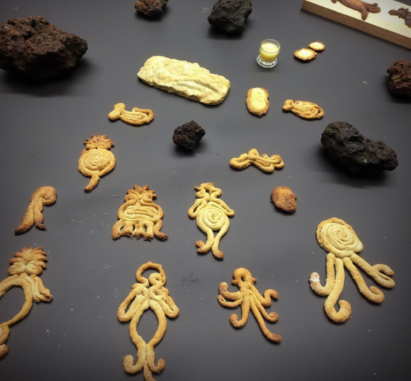Des pâtes fermentées en forme de lave ou roche et des biscuits votifs façonnés à la main s’inspirent de figures anciennes offertes lors des solstices pour appeler le retour du soleil. Les spirales y dessinent des ventres féconds, des flammes enroulées, entrelaçant le corps et le paysage.