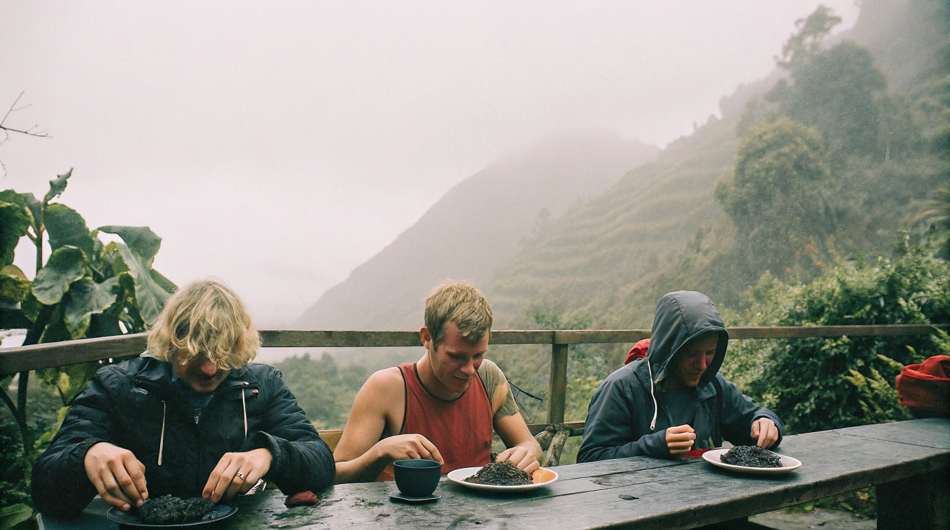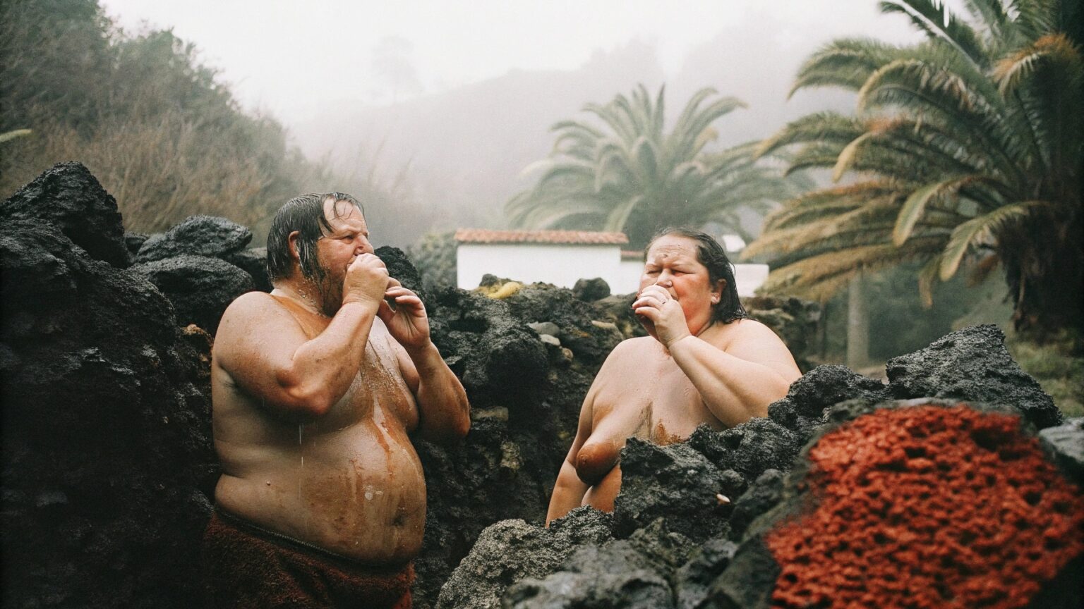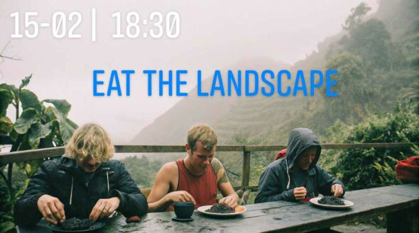 Eat the Landscape critique la consommation insatiable de la nature par le tourisme de masse. L’image, à la fois grotesque et familière, montre des figures dévorant littéralement le paysage— ici les roches volcanique servie rituellement—illustrant comment le tourisme réduit les territoires à de simples ressources.