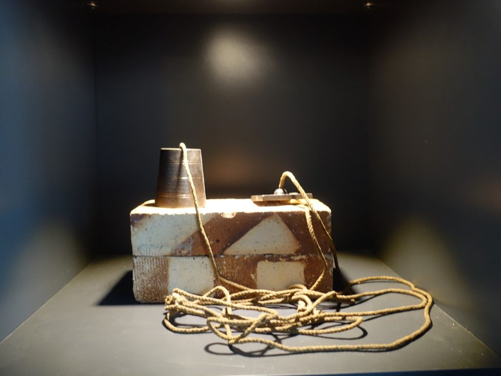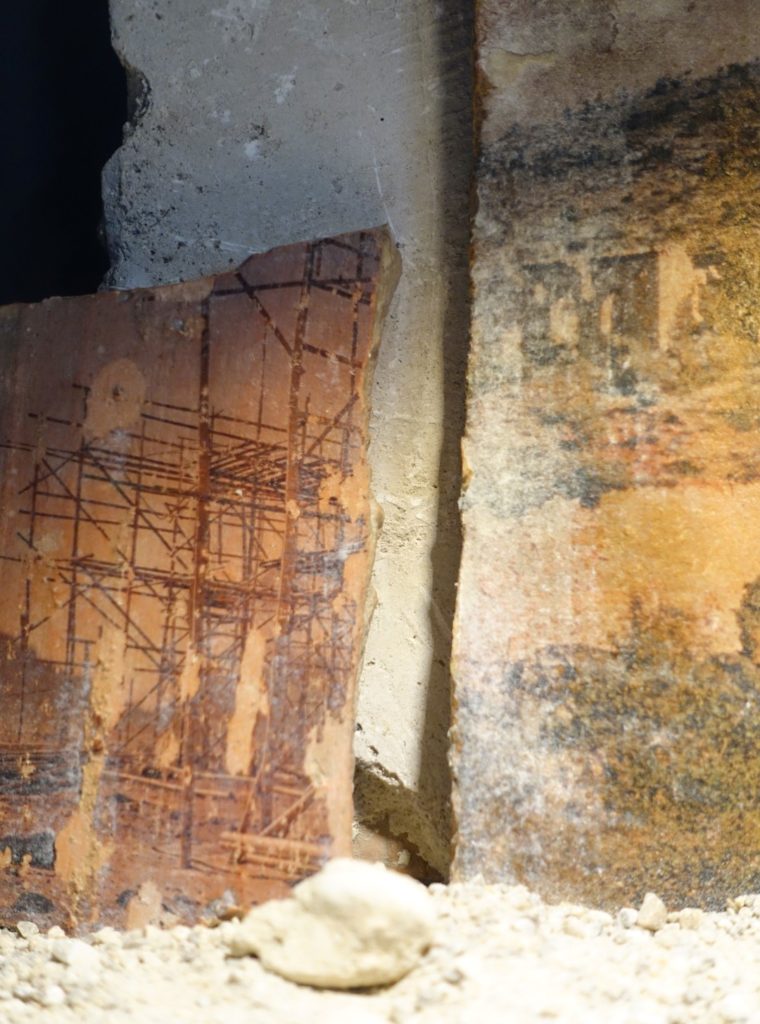 L’image du milieu représente un fil à plomb posé sur des briques refractaires comprenant des empreintes à la chaux d’autres briques ou tomettes. La dernière image à droite est tirée sur travertin, roche sédimentaire calcaire utilisée dans la construction, notamment en tant que carrelage.