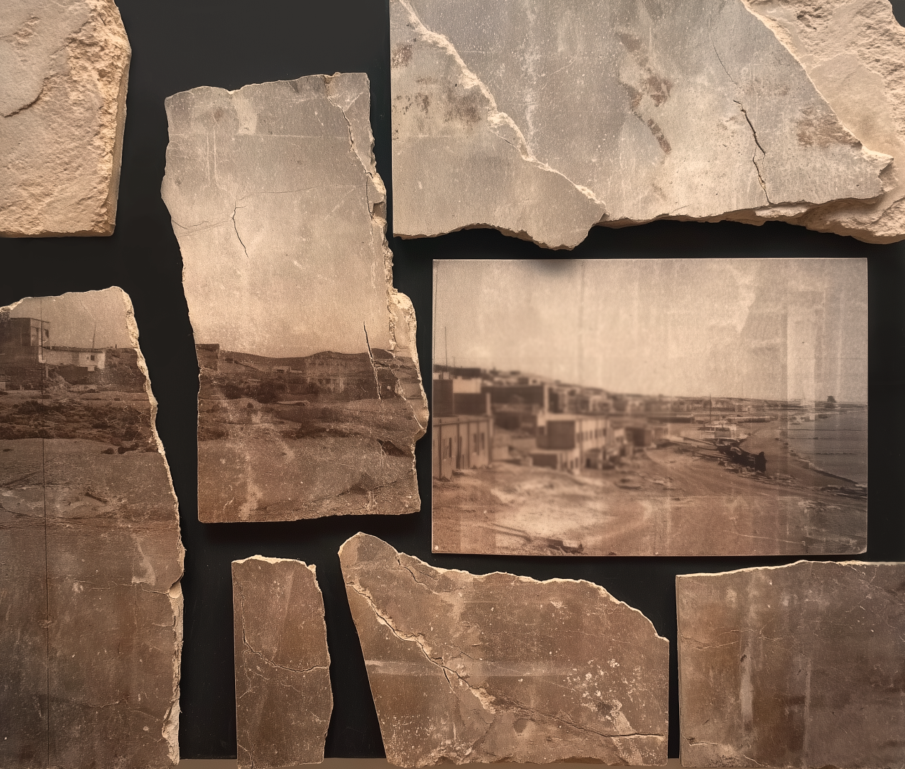 Ces photographies sur fragments de briques du XXe siècle représentent des chantiers et des ruines de bâtiments du sud-est de la France (Var) détruits lors de la seconde guerre mondiale. Elles dialoguent avec d’anciennes tomettes, des briques réfractaires, du plâtre et un carreau du couvent des Ursulines provenant du Musée des Arts et Traditions Populaires de Draguignan.