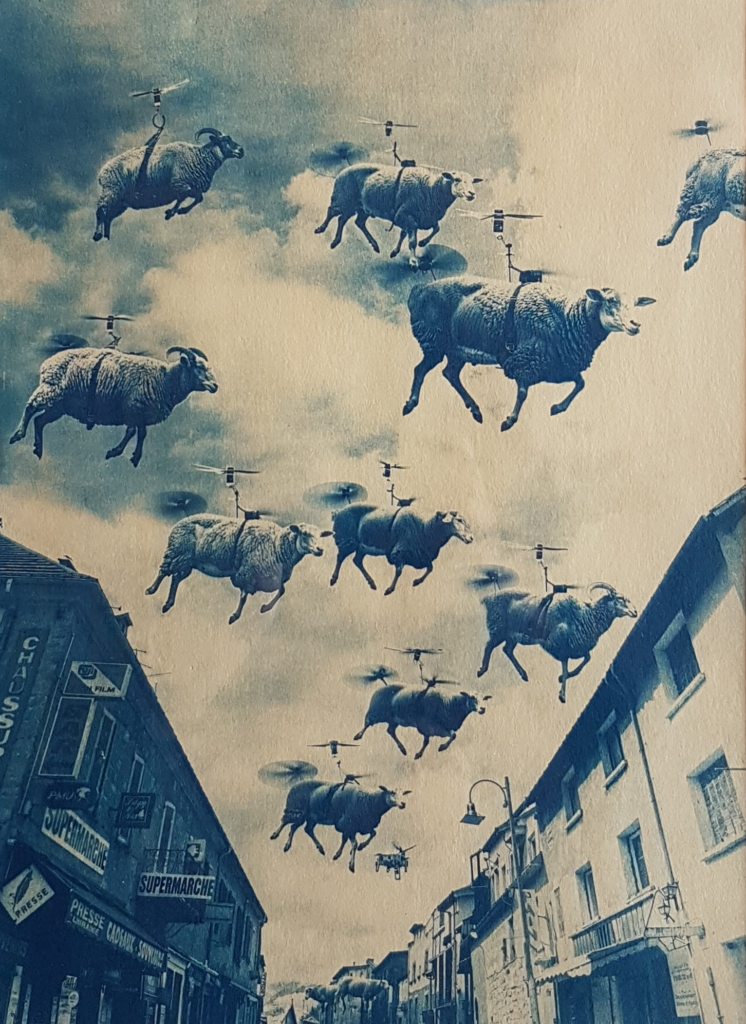 L’exposition présente une variété d’images et de tirages, illustrant l’évolution de la photographie et de la production d’images, de procédés anciens de tirage comme le cyanotype aux technologies modernes. Pour jouer avec la perception du temps et créer des aller-retour entre passé, présent et futur, une grande partie de ces œuvres a été créée à partir de montages numériques, combinant photographies réelles et éléments imaginaires générés ou modifiés par IA.