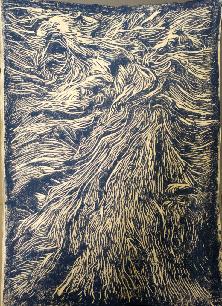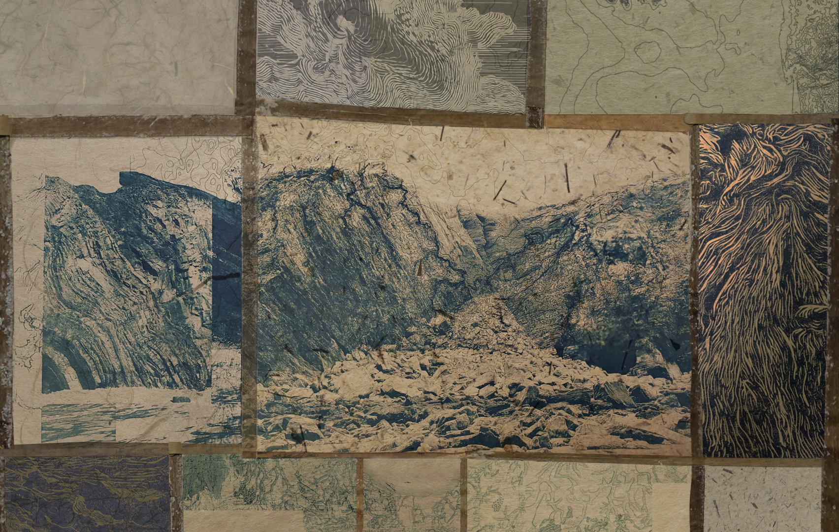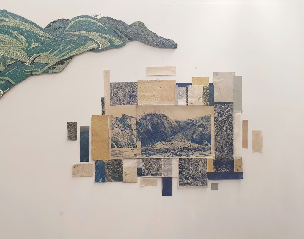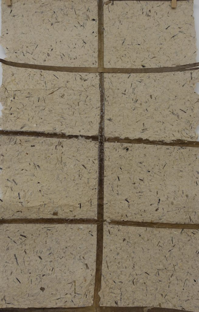 À partir de plantes arrachées par le vent comme le chiendent des sables, ajonc, bruyère ou bien roseaux, fragments canne de Provence ou posidonie échouée en Méditerrannée qui remonte par le fleuve, je fabrique mes propres papiers, qui deviennent supports de gravures, cyanotypes et impressions. Froissés et enduits selon la technique japonaise du momigami, ces papiers « textiles » sont ensuite assemblés en patchworks, mêlant aussi des rebuts de mes expérimentations