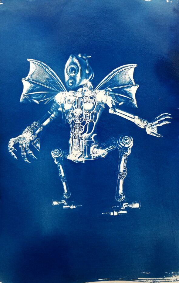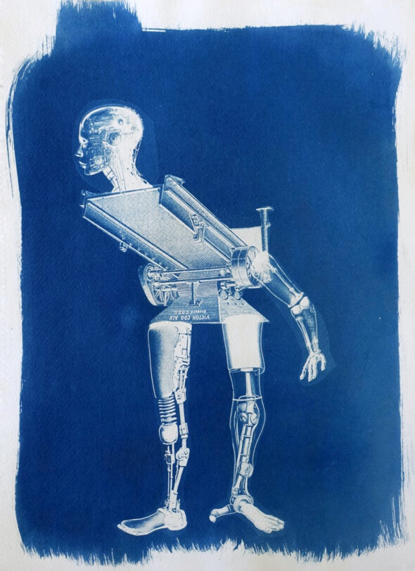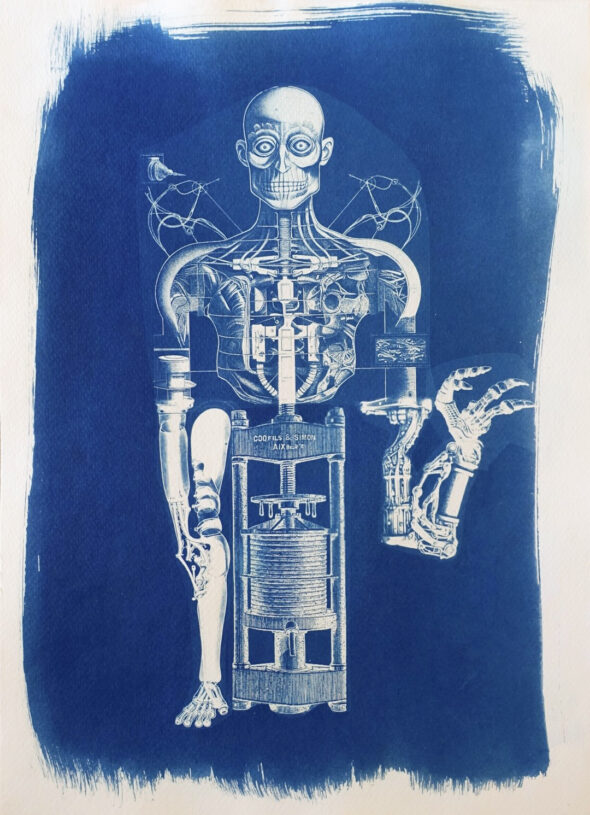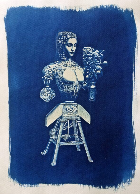 Certaines images ont été tirées en cyanotype sur papier et sur tissu. Le cyanotype est une technique de photographie par contact aux tons bleus, qui remonte aux débuts de la photographie argentique (1842).